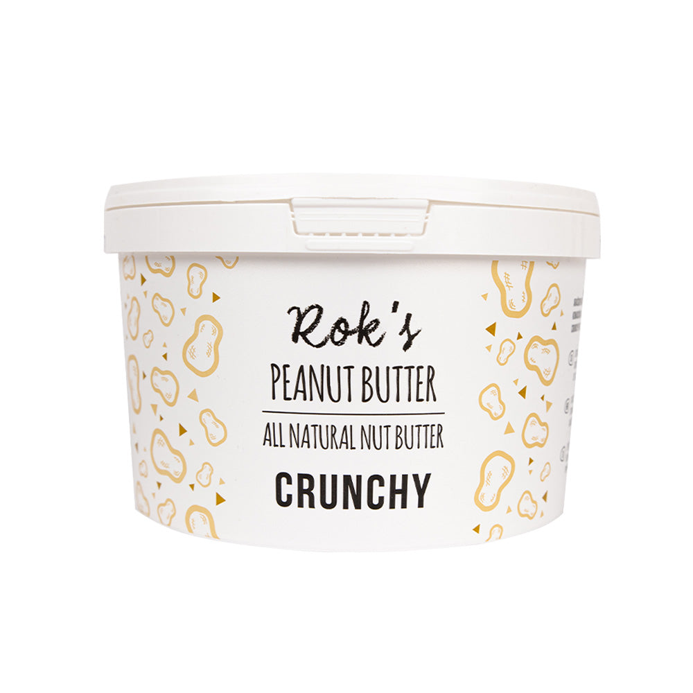 ROK'S PEANUT BUTTER CRUNCCHY, 2000g - SESTAVINE: PRAŽENI ARAŠIDI 100%. Lahko vsebuje sledi OREŠKOV, SOJE in SEZAMOVIH SEMEN. HRANILNA VREDNOST NA 100g - Energijska vrednost: 2547 kJ / 614 kcal | Maščoba: 48,2 g | od tega nasičene maščobe: 6,2 g | Ogljikovi hidrati: 18,2 g | od tega sladkorji: 8,6g | Prehranske vlaknine: 6,4 g | Beljakovine: 23,7 g | Sol: 0g. UPORABA: Uporabno najmanj do datuma označenega na pokrovčku; serija ali lot (L) ali (LOT) se nahaja na embalaži. Hraniti pri temperaturi do 25 °C, v hladnem in suhem prostoru. Neto količina 2000g. Proizvaja Rok's nut butter d.o.o., Goričica pri Ihanu 19/b, 1230 Domžale, Slovenija.