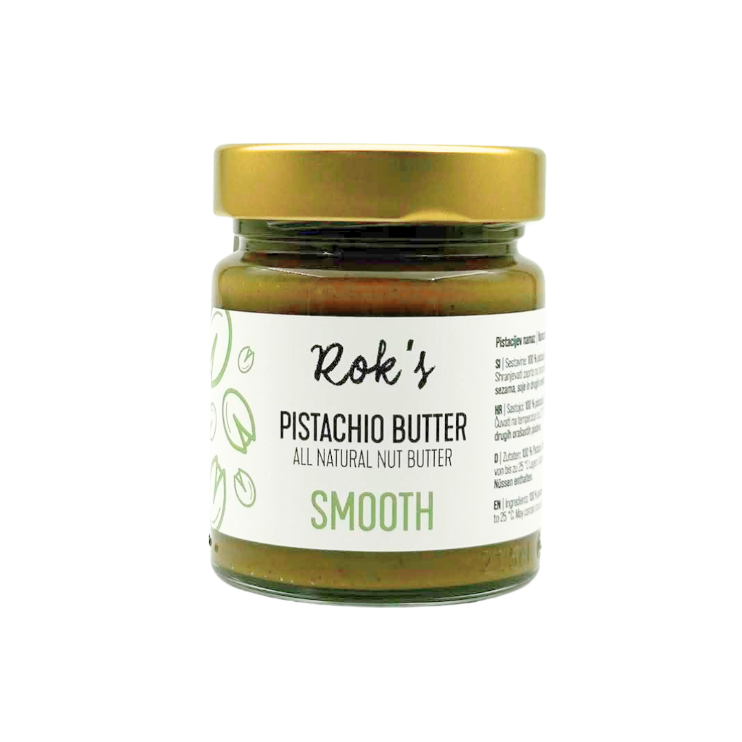 ROK'S Pistacijin namaz kremni 200 g- SESTAVINE: 100% pistacija. Lahko vsebuje sledove arašidov, sezama, soje in drugih oreškov. UPORABA: Uporabno najmanj do datuma označenega na ovitku; serije oz. lot (L) ali (LOT) je na embalaži. Shranjujte pri 25 °C, v hladnem in suhem prostoru. Hranilna vrednost na 100g: Energijska vrednost: 2732 kJ / 660 kcal | Maščobe: 56 g | od tega nasičene maščobe: 6 g | Ogljikovi hidrati: 13 g | od tega sladkorji: 5 g |Beljakovine: 23 g | Prehranske vlaknine: 3 g |Sol: 0,12 g. Neto teža 200 g. Proizvaja Rok's nut butter d.o.o., Goričica pri Ihanu 19/b, 1230 Domžale, Slovenija.